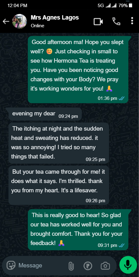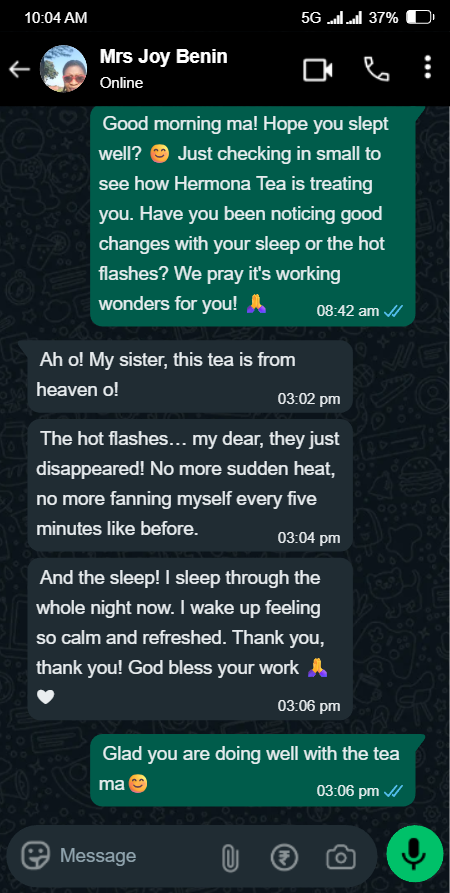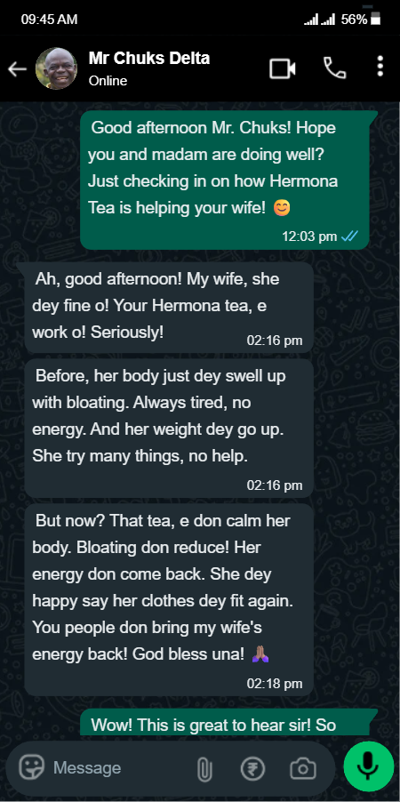 Listen to me, my sister. Don’t let anyone tell you this misery is ‘normal’ or something you just have to ‘manage.’ That is a lie. This is a problem, and Hermona Herbal Tea is the solution. I feel like myself again. I feel like Funke again. Please, don’t suffer as I did. Try this tea.”