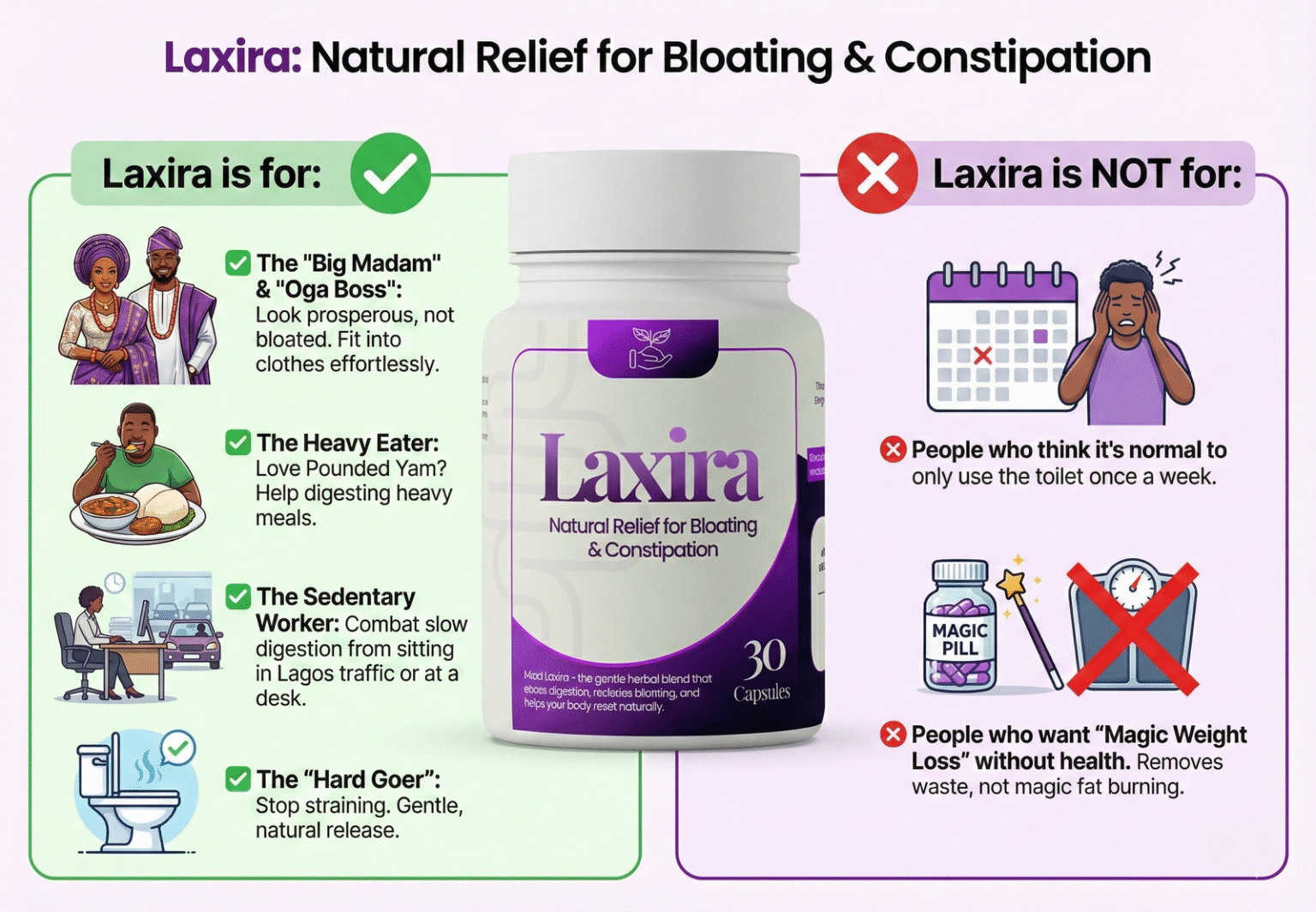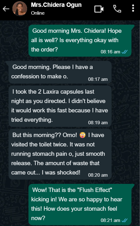Listen to me, my sister & brother. Don’t let anyone tell you that not going to the toilet for days is ‘normal’ or something you just have to ‘manage.’ That is a lie. This is a dangerous problem, and Laxira is the solution. I feel light again. I feel like Chioma again. Please, don’t suffer as I did. Try this capsule.
