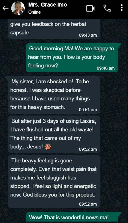 "I just want to say God bless you. I bought the Laxira capsule last week. The way my stomach used to swell up like a drum after eating small food is gone. I feel so light now. Thank you so much."